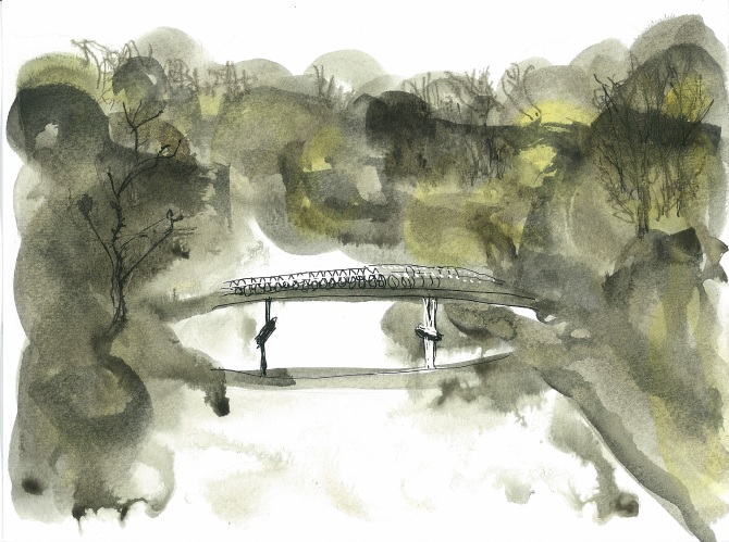 A painting of the footbridge over the River Kelvin to the Botanic Gardens in Glasgow.